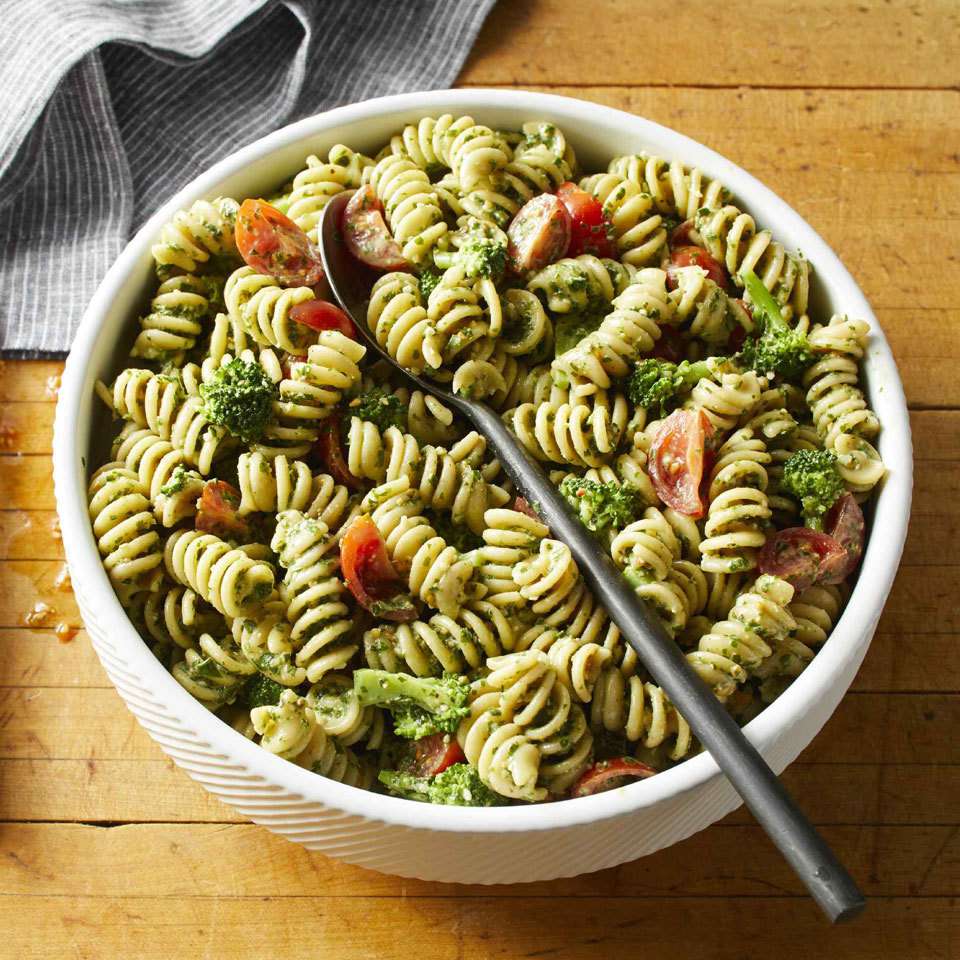 Toss fusilli pasta with a homemade or store-bought basil pesto, along with blanched broccoli, cherry tomatoes, zucchini, and roasted red peppers. Add a handful of nuts or seeds for crunch. This one’s herbaceous, hearty, and a great make-ahead option.