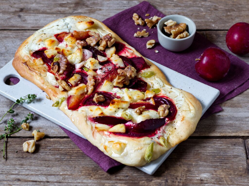 Elevate your dinner game with a plum and goat cheese flatbread. Spread soft cheese over a flatbread base, top with thinly sliced plums, fresh thyme, and a drizzle of olive oil. Bake until crispy and golden. This sweet-savory combination makes a perfect light meal, appetizer, or party snack—and it looks as good as it tastes!