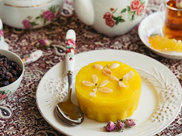 A saffron-infused, sweet rice pudding served during festivals. It includes rose water, cardamom, and pistachios—similar to Indian phirni.